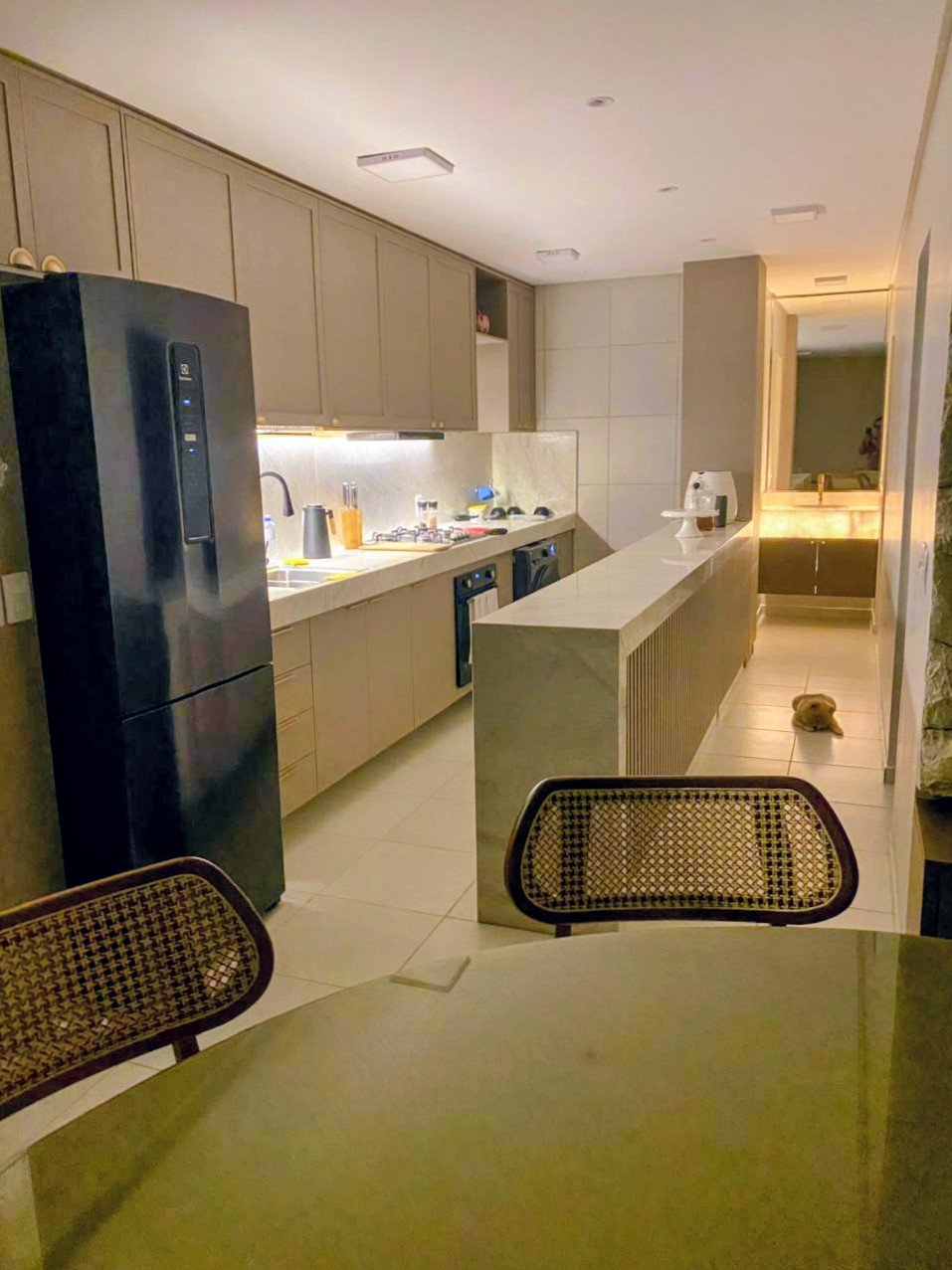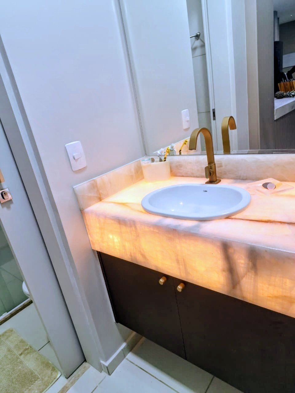 O diferencial é que o apartamento está sendo vendido na modalidade porteira fechada, incluindo móveis projetados, cozinha equipada com eletrodomésticos, camas e demais móveis – perfeito para investidores que buscam um imóvel pronto para locação por temporada em plataformas como Airbnb e Be My Guest. A cozinha possui bancada e pia em mármore Calacatta, os banheiros têm pias em travertino e ônix, com detalhes em pedra fogo na sala, que conferem um acabamento elegante e sofisticado.