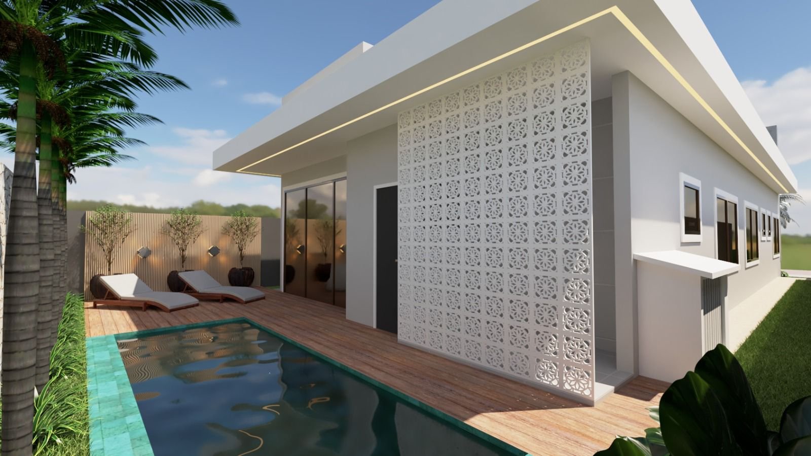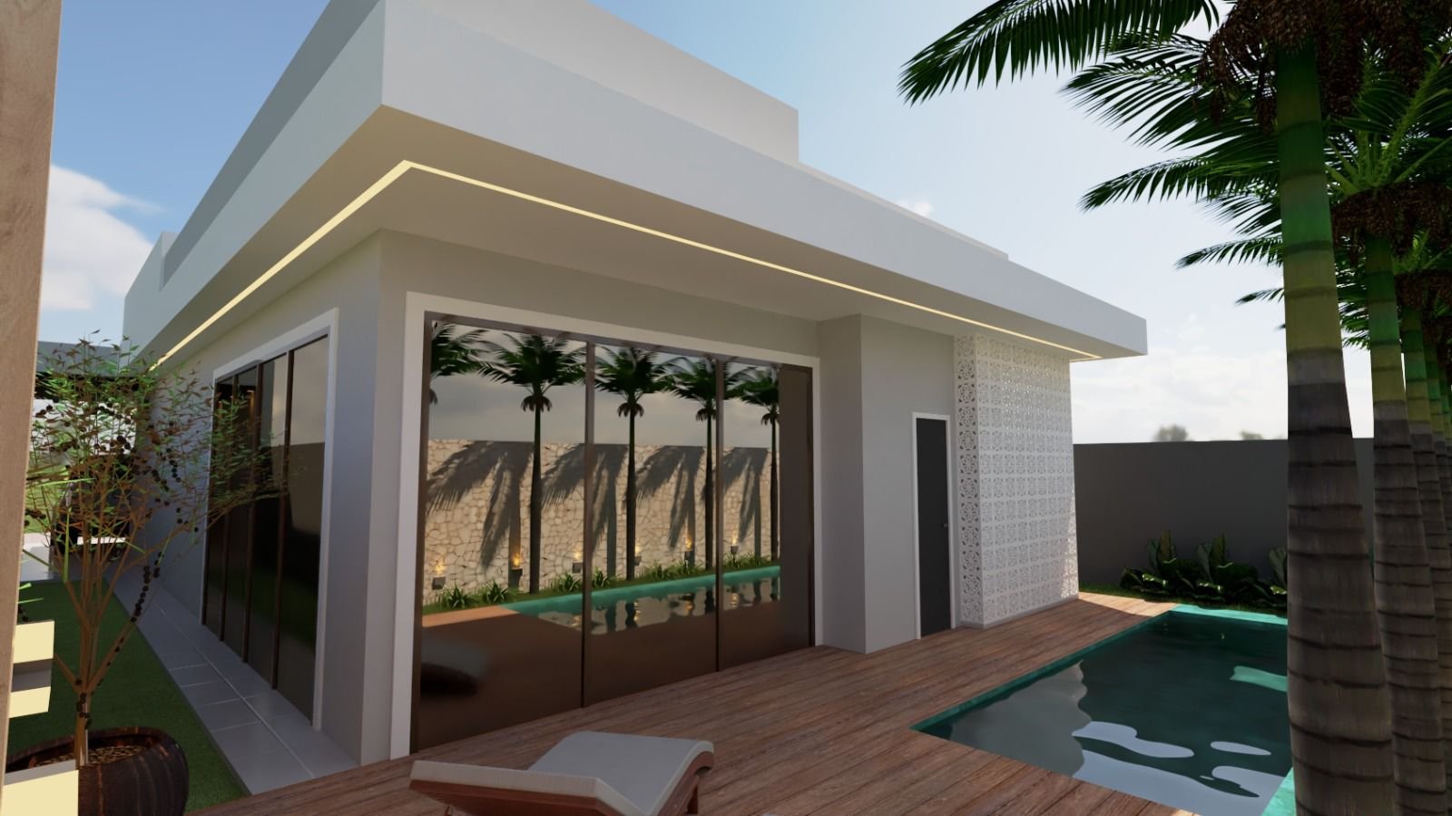 A casa oferece piscina com hidromassagem, varanda gourmet equipada com móveis e churrasqueira de bancada, além de projeto de iluminação diferenciado. A cozinha conta com ilha, móveis projetados e cooktop, enquanto o banheiro social fica no deck. Todo o acabamento inclui 100% porcelanato, bancadas em granito preto São Gabriel e pé direito alto.