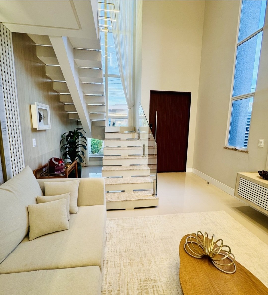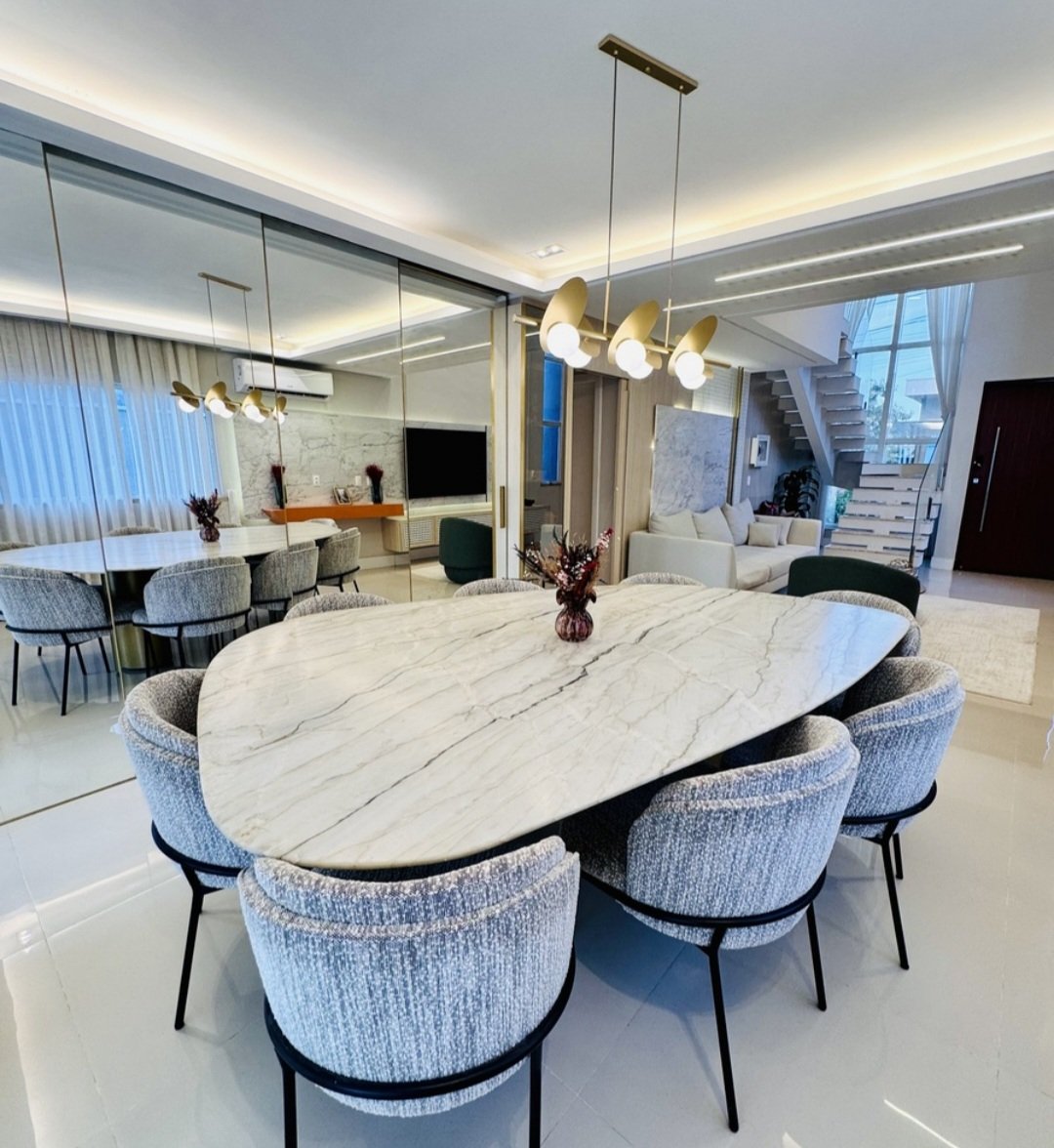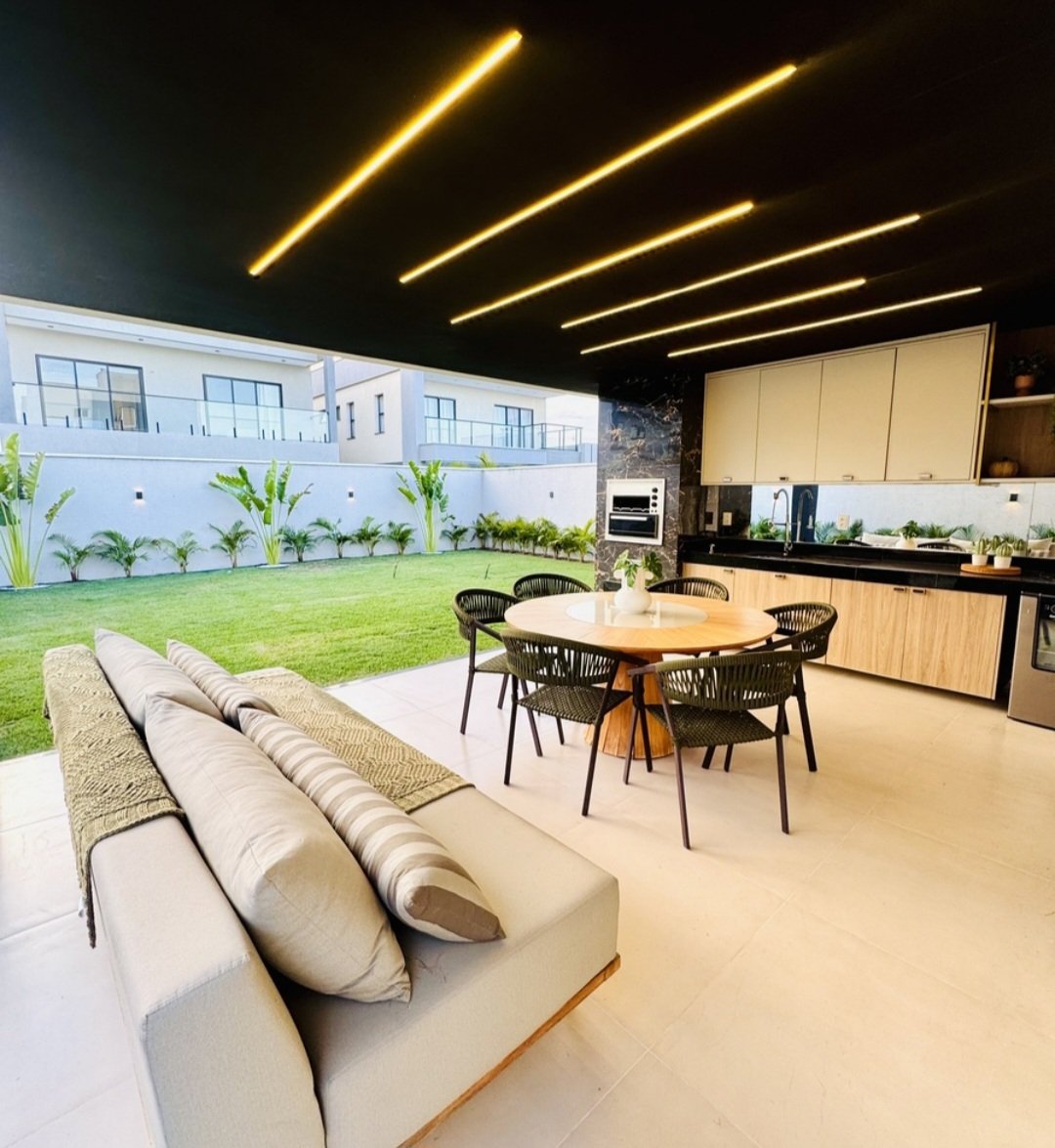 Área social integrada: Living amplo com pé-direito alto, cozinha gourmet americana equipada com ilha de granito, eletrodomésticos premium (fogão cooktop, geladeira side-by-side, forno embutido) e lavanderia separada. Fluxo perfeito entre sala de jantar, home theater e varanda gourmet coberta — ideal para churrascos em família.