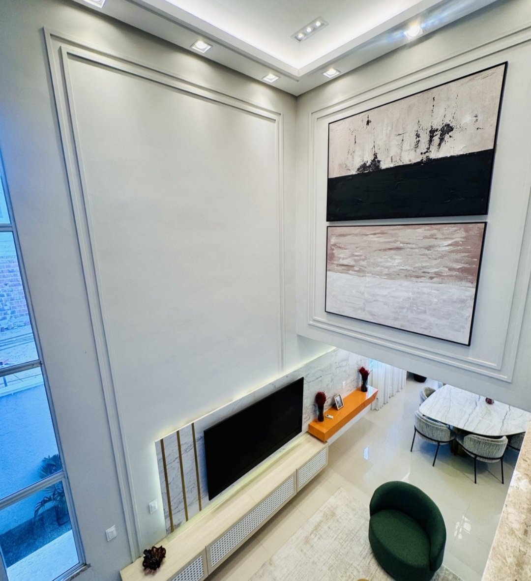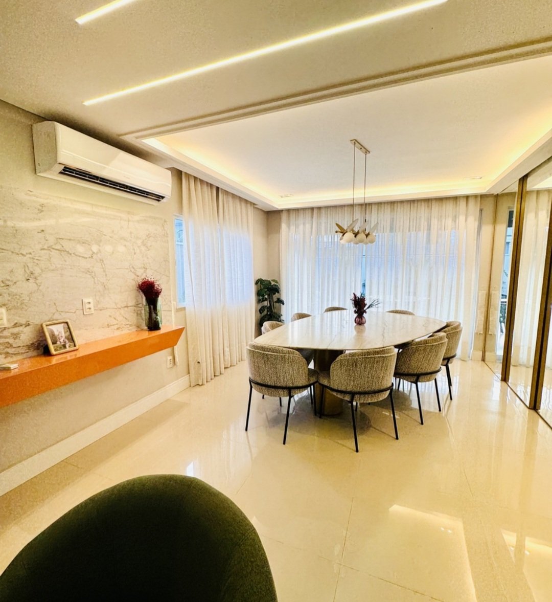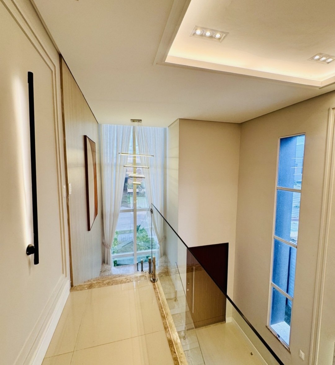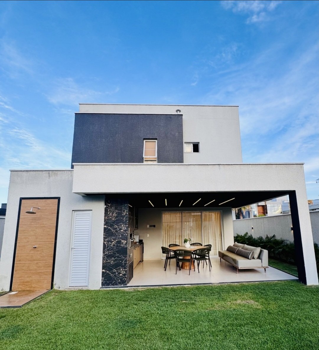 Área social integrada: Living amplo com pé-direito alto, cozinha gourmet americana equipada com ilha de granito, eletrodomésticos premium (fogão cooktop, geladeira side-by-side, forno embutido) e lavanderia separada. Fluxo perfeito entre sala de jantar, home theater e varanda gourmet coberta — ideal para churrascos em família.