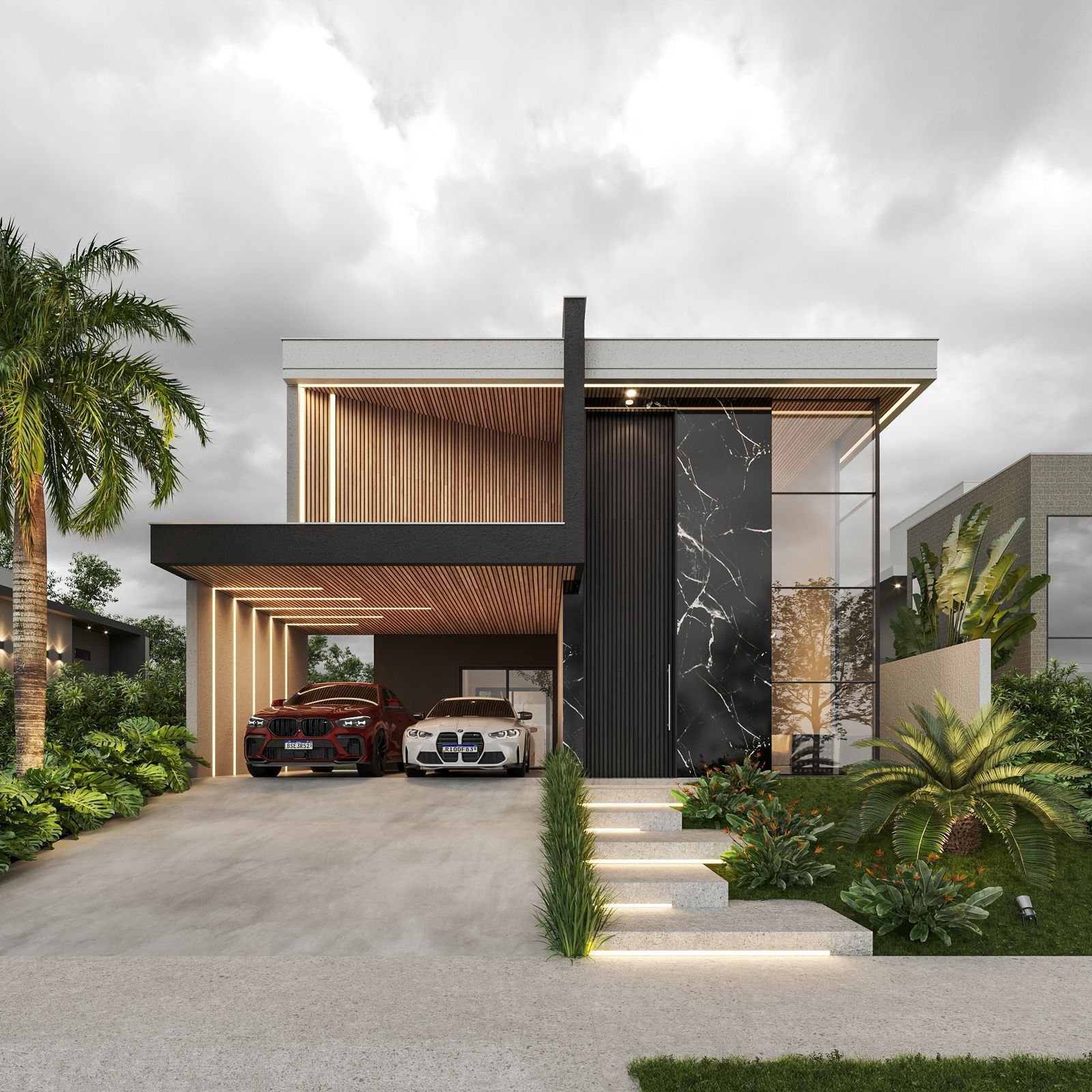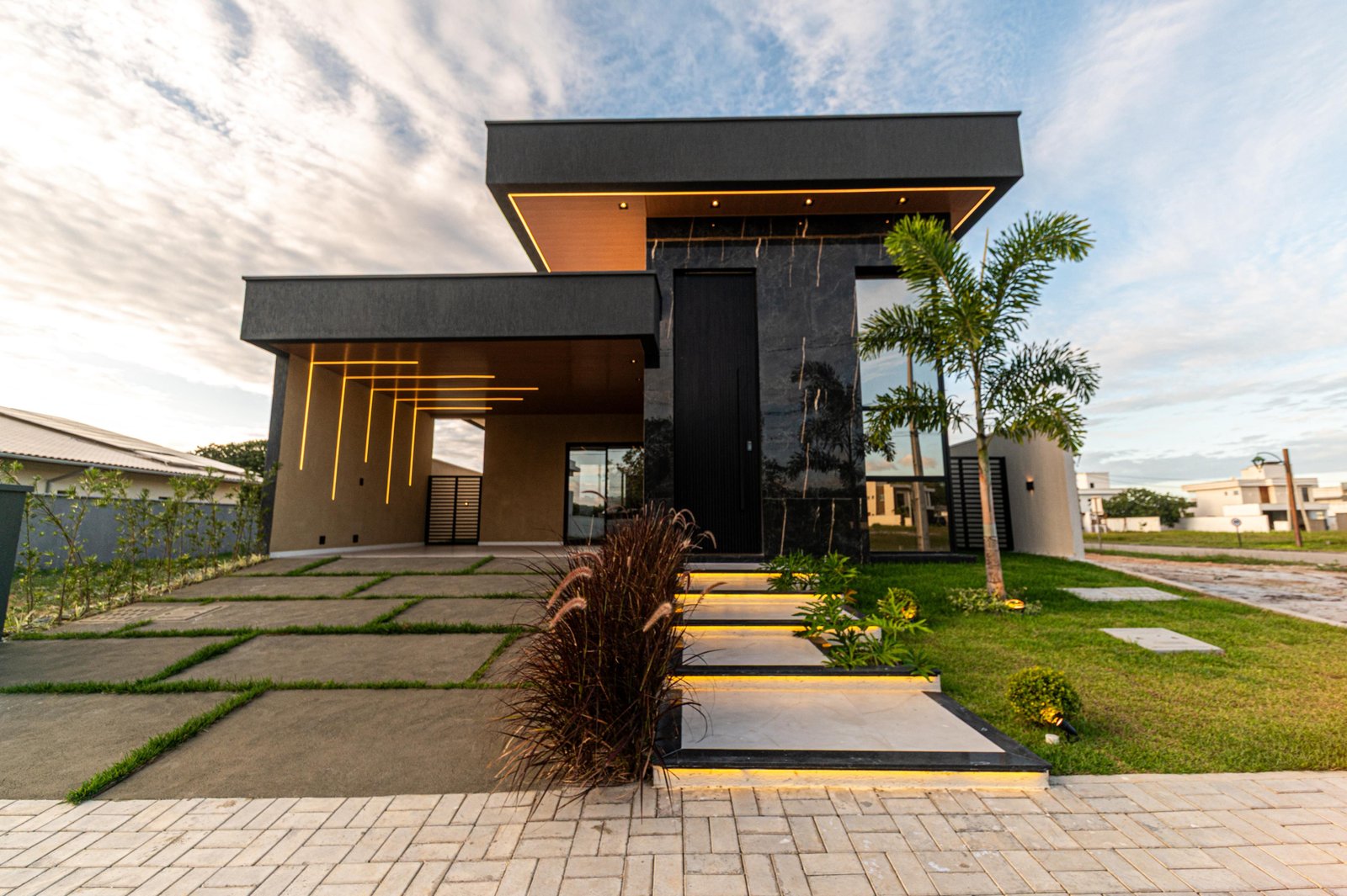 O projeto luminotécnico planeja a iluminação de forma estratégica, valorizando cada ambiente e criando uma atmosfera acolhedora. O paisagismo complementa o visual externo, harmonizando a casa com a natureza ao seu redor. Na sala, o pé direito alto potencializa a sensação de amplitude e elegância.