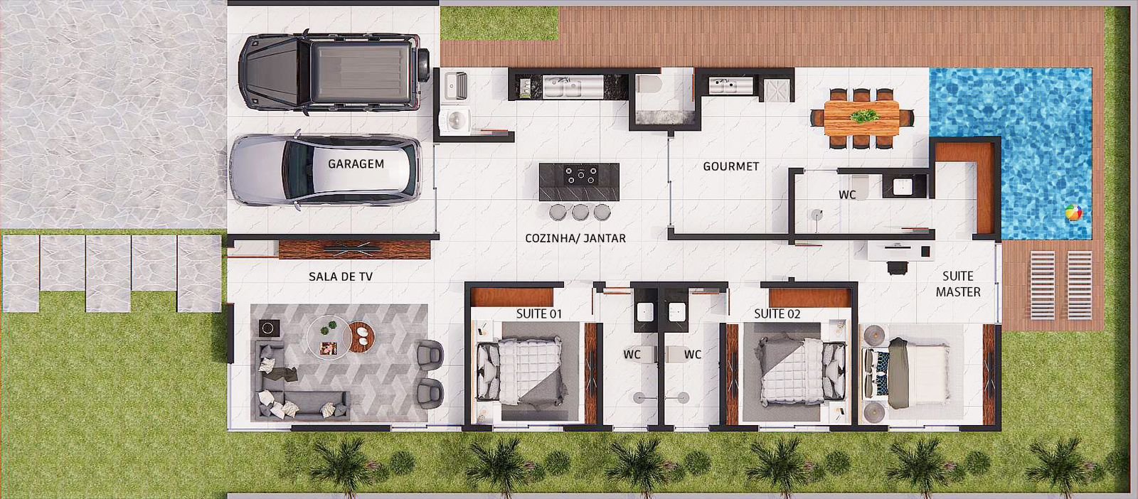 Na área íntima, a casa conta com 3 suítes, sendo a suíte master com closet, garantindo privacidade e organização. A cozinha é um sonho para quem gosta de cozinhar, com ilha central e fogão cooktop de indução, otimizando o espaço e trazendo um toque moderno e funcional.