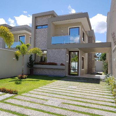 Casa plana moderna à venda em Eusébio, com 82 m² construídos em terreno 6x25m. Possui 2 suítes + gabinete, bancadas em pedra Perla Santana, 2 vagas de garagem e fica em loteamento murado (aberto na frente). Pronta para morar por R$ 365.000.