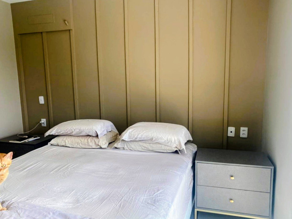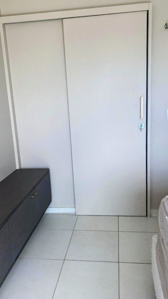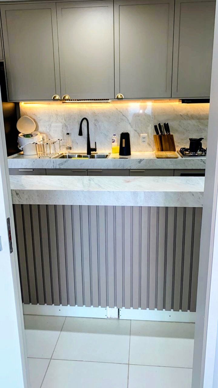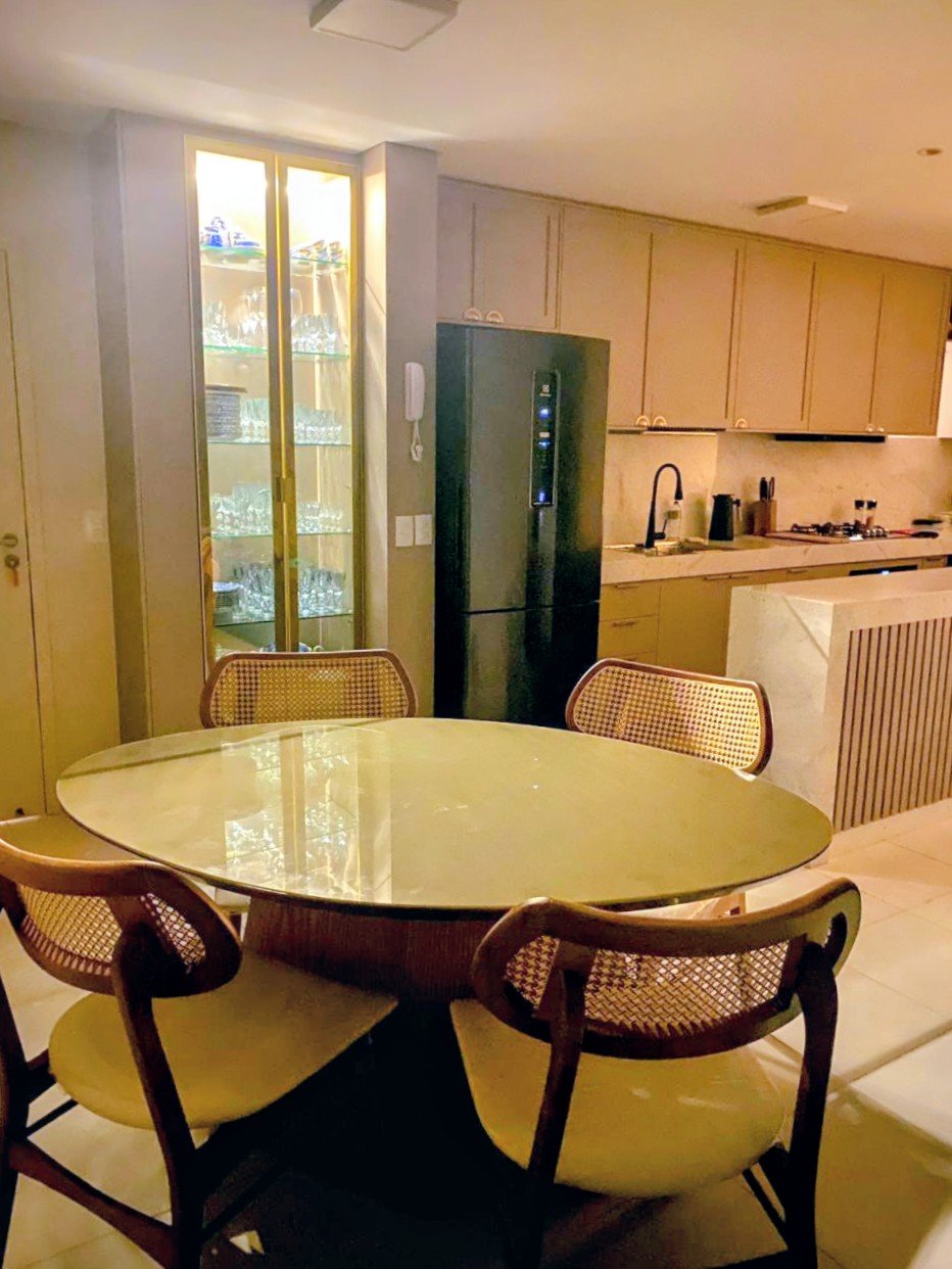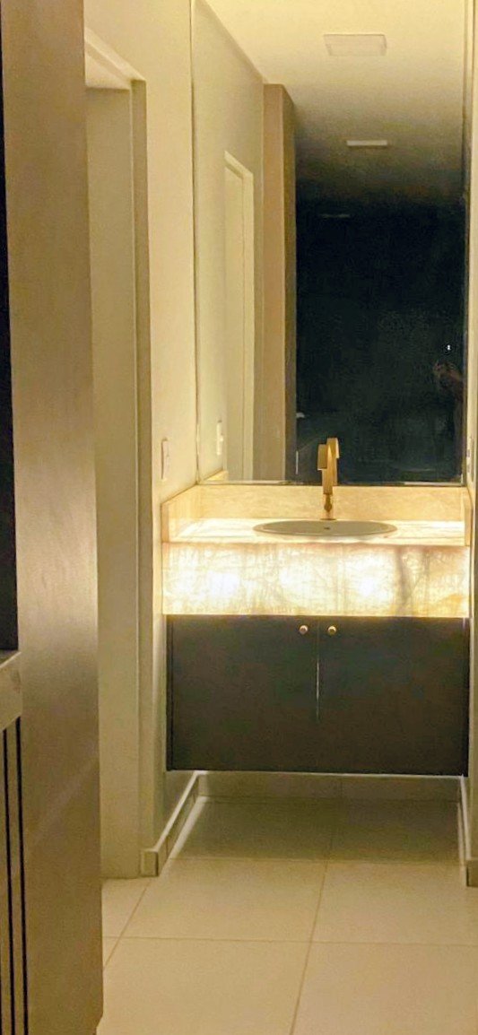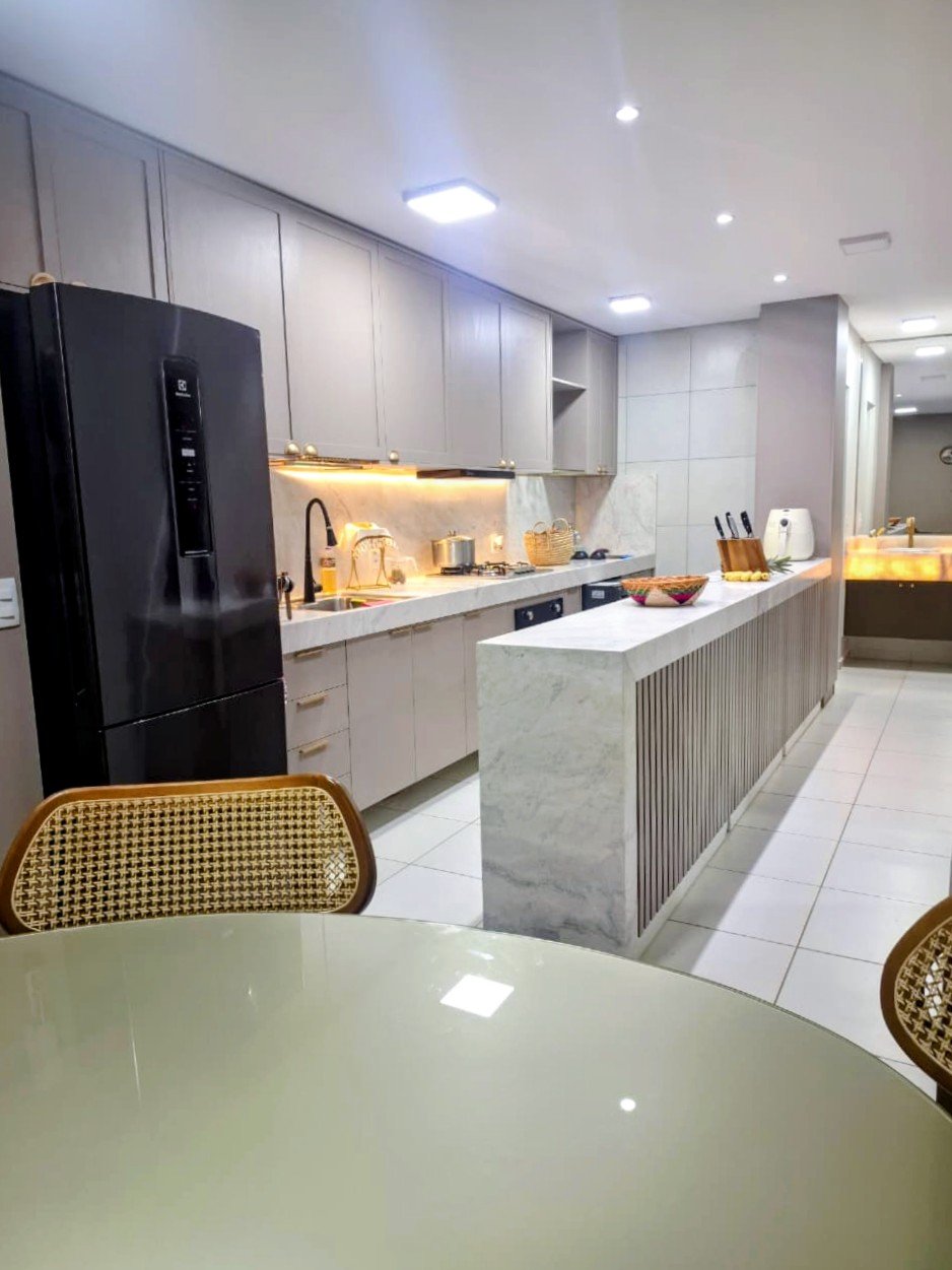 O diferencial é que o apartamento está sendo vendido na modalidade porteira fechada, incluindo móveis projetados, cozinha equipada com eletrodomésticos, camas e demais móveis – perfeito para investidores que buscam um imóvel pronto para locação por temporada em plataformas como Airbnb e Be My Guest. A cozinha possui bancada e pia em mármore Calacatta, os banheiros têm pias em travertino e ônix, com detalhes em pedra fogo na sala, que conferem um acabamento elegante e sofisticado.