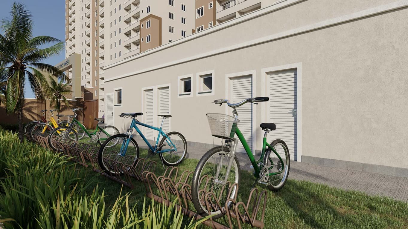 Apartamentos de 2 quartos, com áreas privativas que incluem giardinos para os apartamentos do térreo. Cada unidade terá uma vaga de garagem.