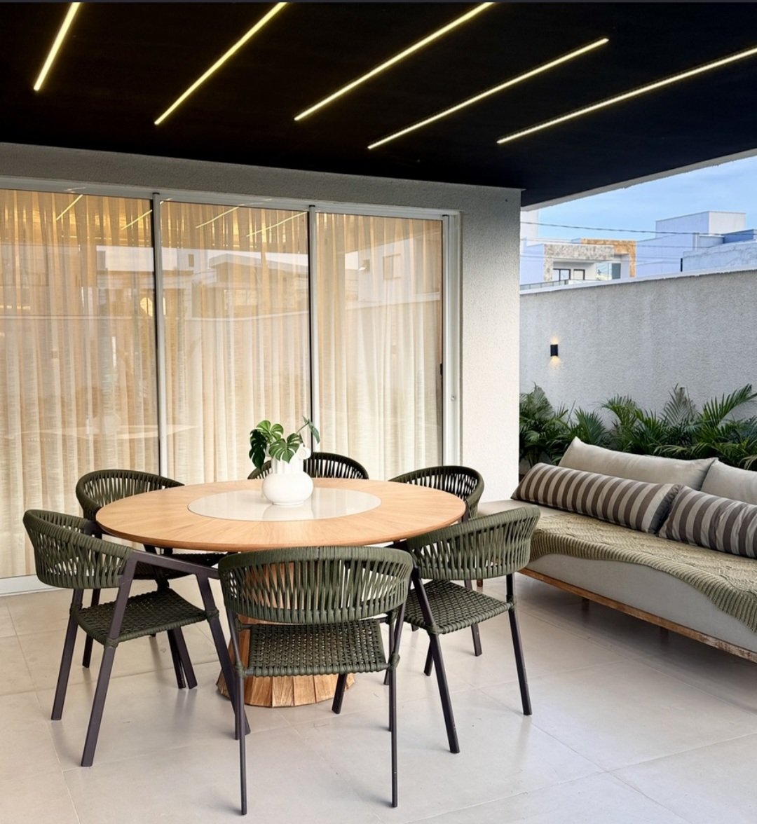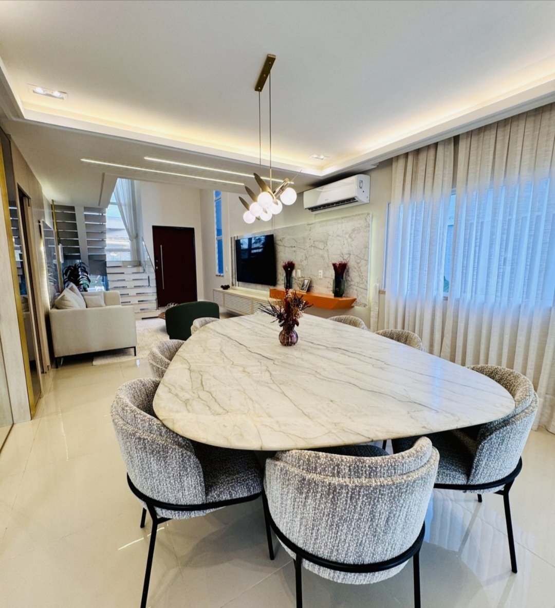 Área social integrada: Living amplo com pé-direito alto, cozinha gourmet americana equipada com ilha de granito, eletrodomésticos premium (fogão cooktop, geladeira side-by-side, forno embutido) e lavanderia separada. Fluxo perfeito entre sala de jantar, home theater e varanda gourmet coberta — ideal para churrascos em família.
