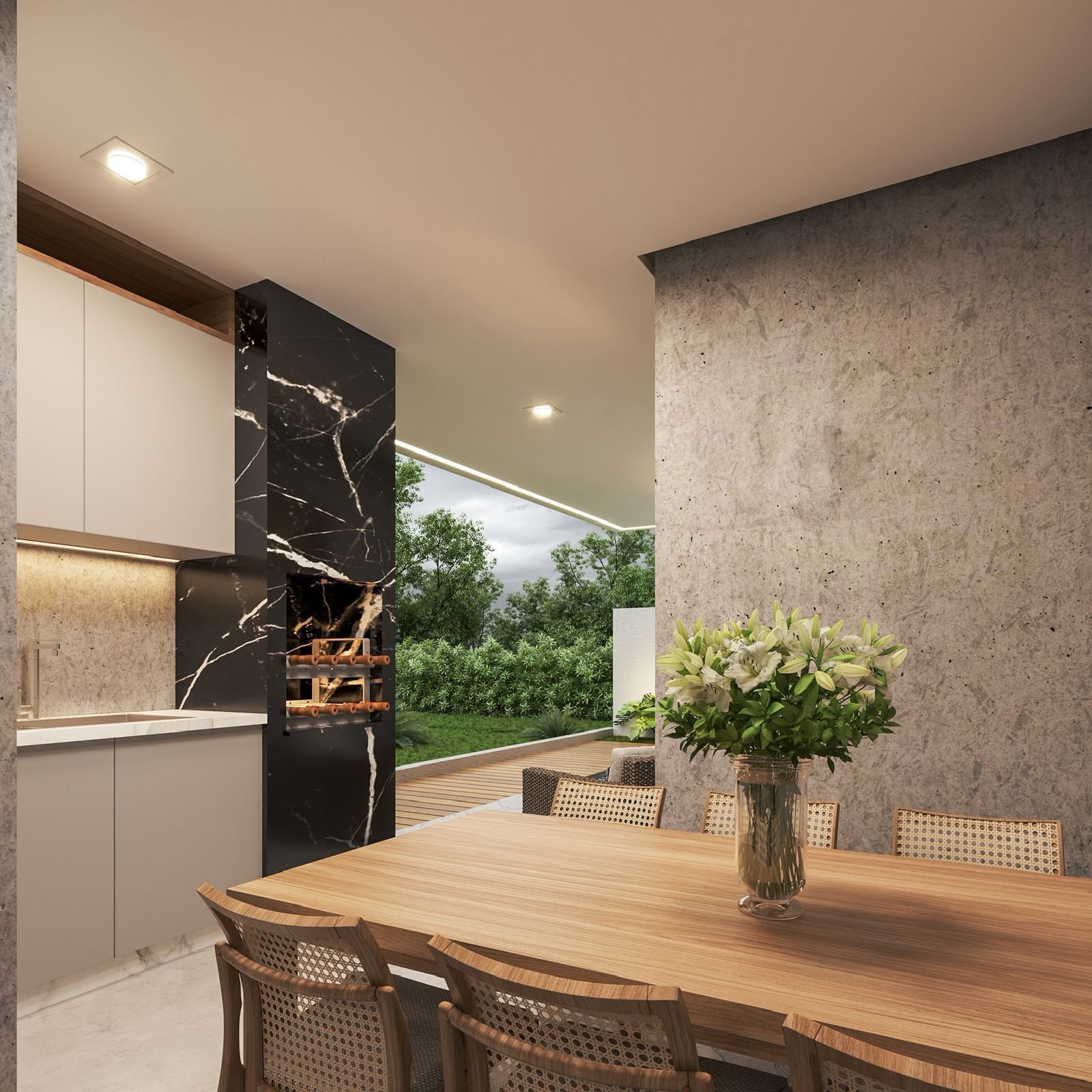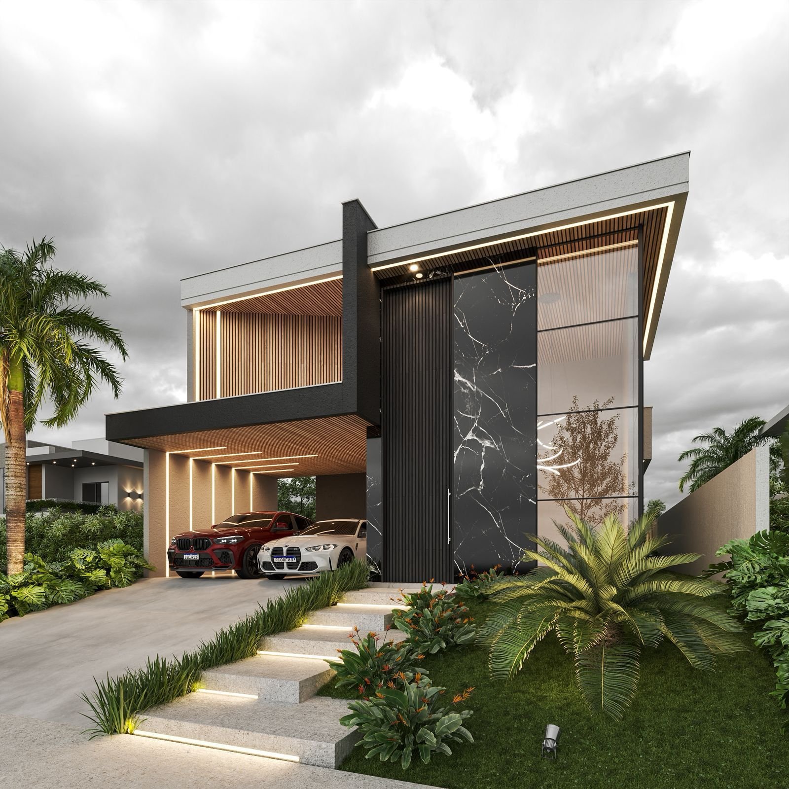O projeto luminotécnico planeja a iluminação de forma estratégica, valorizando cada ambiente e criando uma atmosfera acolhedora. O paisagismo complementa o visual externo, harmonizando a casa com a natureza ao seu redor. Na sala, o pé direito alto potencializa a sensação de amplitude e elegância.
